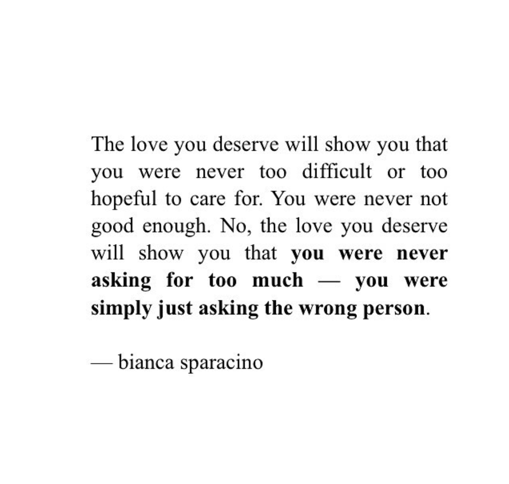 Because I feel heartbroken and even abandoned, I begin reading this excited for the message. Midway through, however, I realize that I did have someone who loved me and thought me good enough. When Bianca talks about “asking the wrong person”, she is talking about me, not to me.